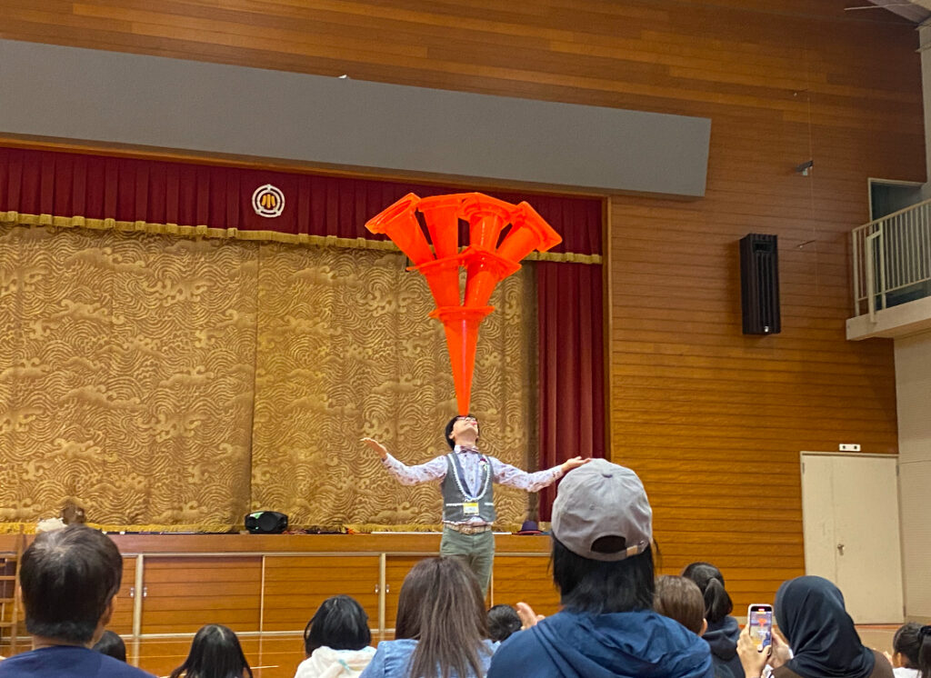 体育館内ではNPO法人で活動されている、天羽さんチームによる参加型のエンタメワークショップを行って頂きました。子供たちも食い入るようにパフォーマンスに集中して観ていました。
