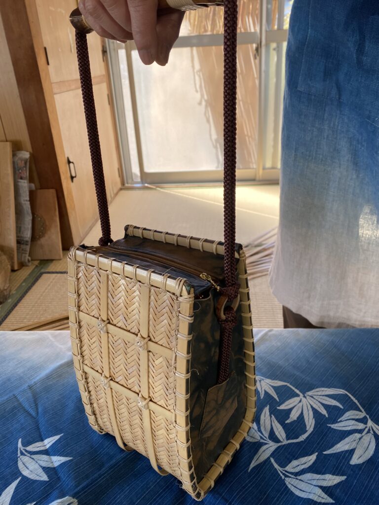 藍と泥で染めた鹿の皮と竹細工のコラボバック