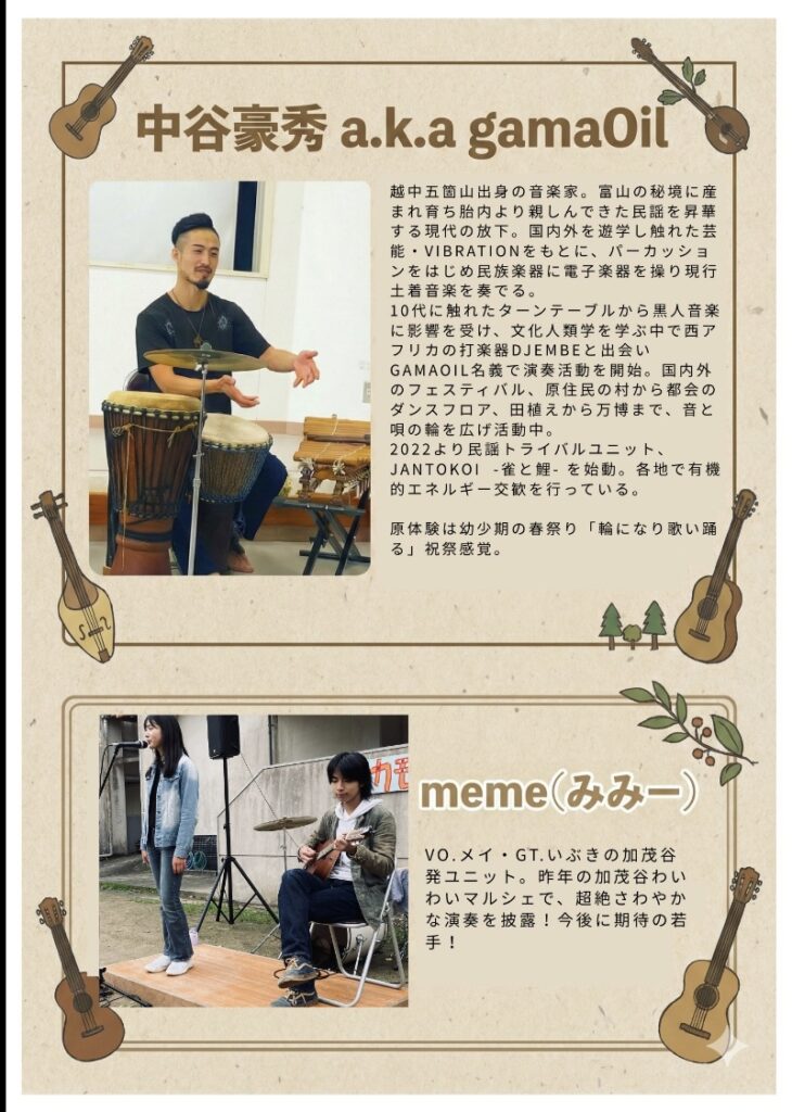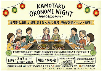 KAMOTAKU OKONOMI NIGHT 2026年2月28日 協力隊長谷川 どうもお世話になります、協力隊の長谷川です。 3月7日(土)17時~20時頃の予定で、協力隊の関さん主催でかも宅お好みナイトというイベントを開催します。お時間ある方、タイミングの良い方、お好み焼き好きの方、音楽好きの方などなどぜひぜひお越しください。 当日は加茂谷の若手、爽やかコンビ芽樹&芽依こと【meme】や京都から実力派ミュージシャンの【gamaOil】さんもお越し頂き加茂谷を盛り上げてくれますので、当日をお楽しみに♪